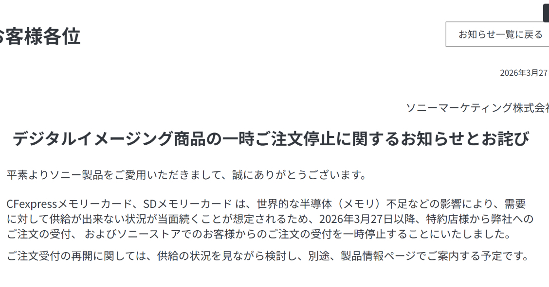 2026年3月29日、ソニーがCFexpressおよびSDカードの注文受付を一時停止しました。半導体不足が影響しているとのことですが、これにより多くのユーザーが影響を受ける可能性があります。現代では、データの保存や転送が非常に重要になっているので、このニュースは特に注目を集めています。
